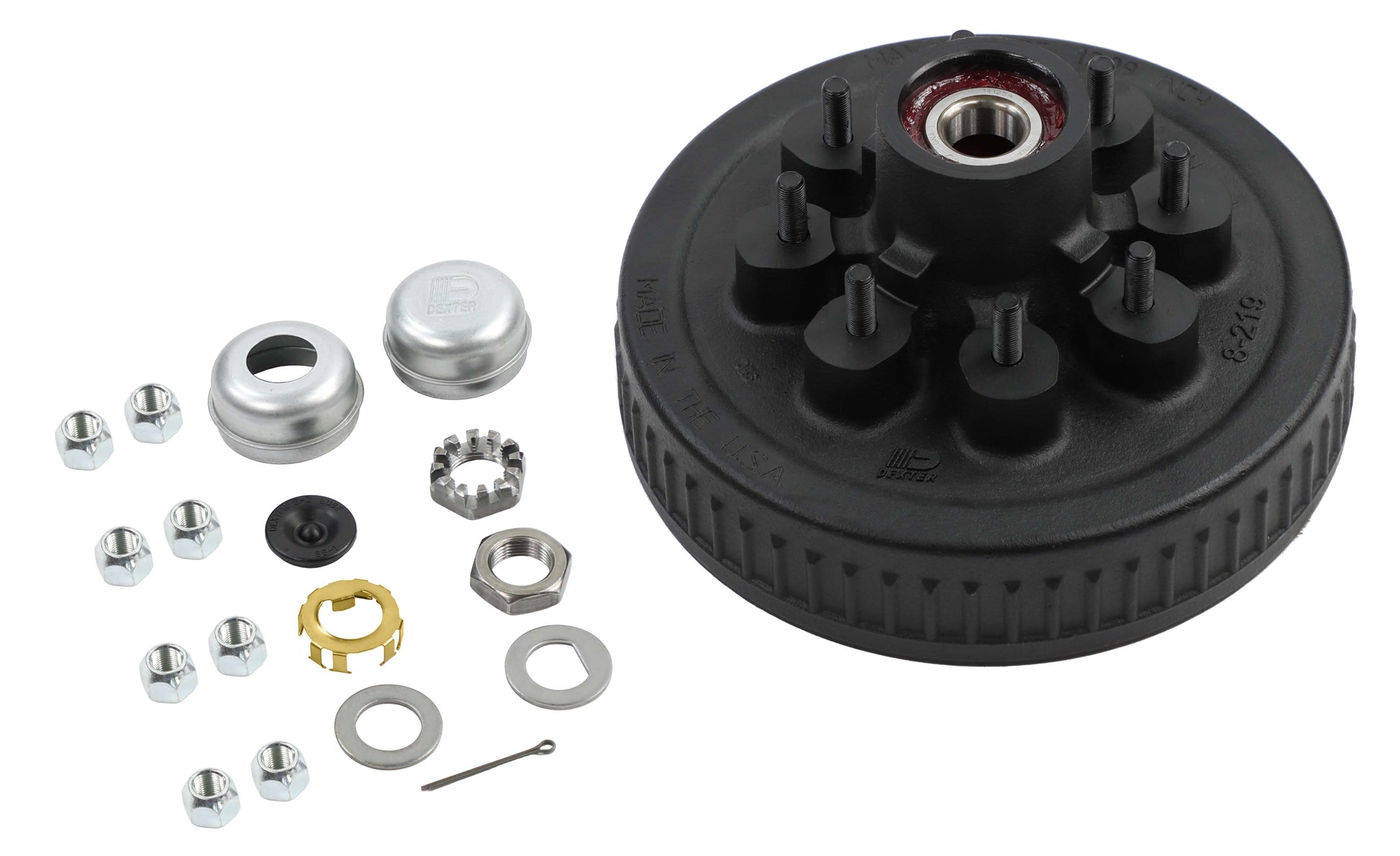 Dexter® Complete Pre-Greased Hub-Drum Assembly, Retail Boxed, #42 Spindle, E-Z Lube® or Grease Lube, Lube, 5.2K-7K Capacity Per Pair, 8 on 6.5" Bolt Pattern, 1/2" Studs, Pregreased